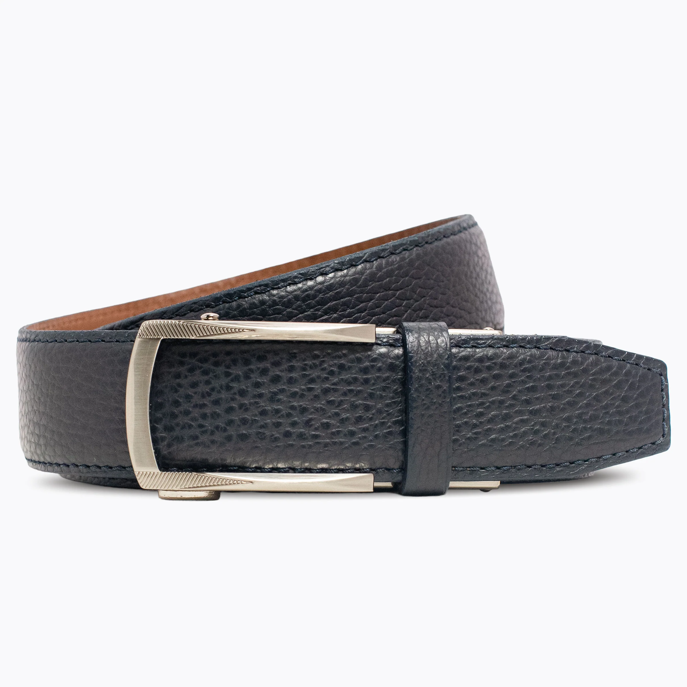 A matching navy leather strap keeper and our signature lever-style buckle complete the design, blending premium craftsmanship with everyday functionality. The result: a belt that moves seamlessly from office to evening, pairing flawlessly with dresswear, elevated casual, and winter wardrobes.