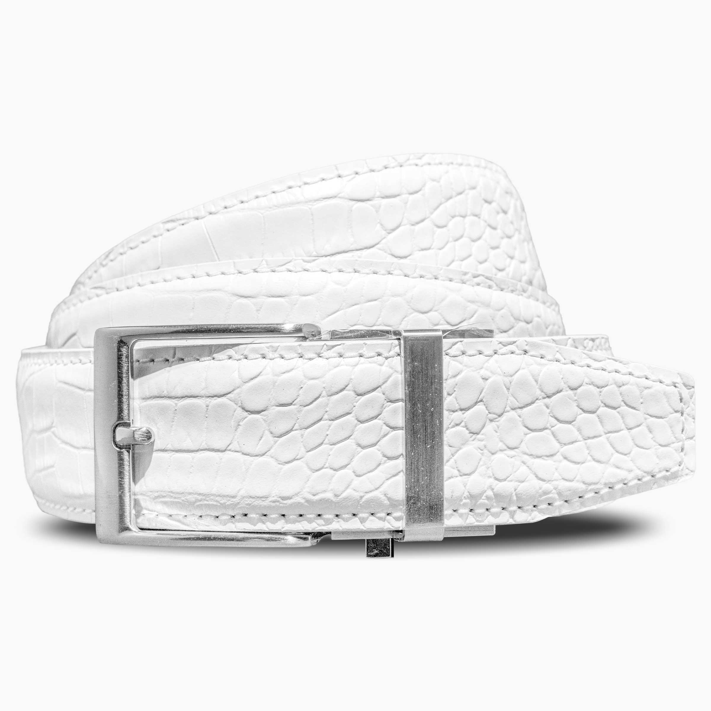 The crisp white finish offers a modern, polished aesthetic—perfect for formal occasions, upscale events, or standout summer styling. Finished with a classic brushed silver buckle, this belt balances luxury with versatility, making it an essential accessory for the discerning dresser.